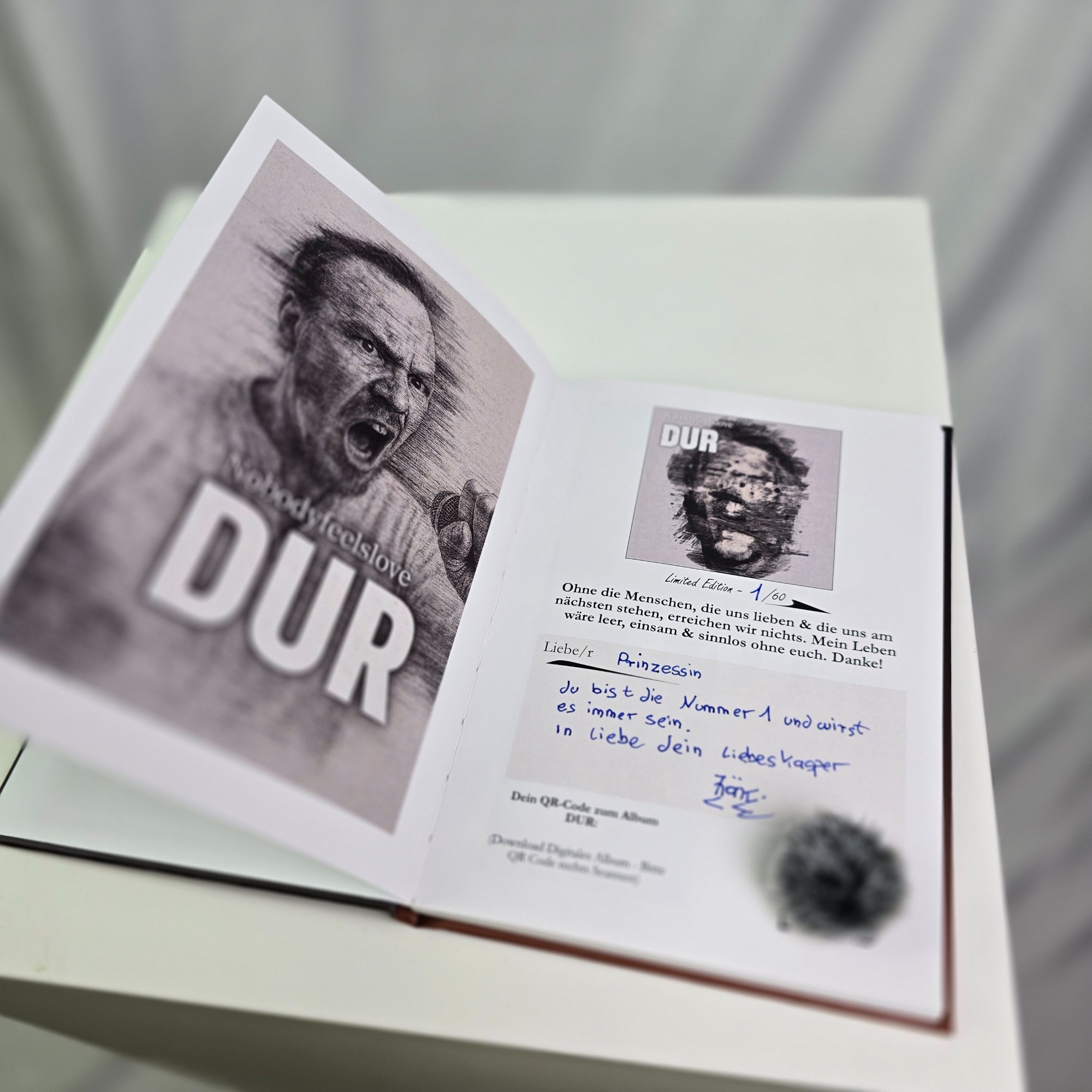 „DUR“ ist mehr als nur ein Album. Es ist ein Statement für die Menschlichkeit. Jedes Exemplar wird als Hardcover-Buch mit Fadenheftung rundem Rücken, 72 Seiten, matt kratzfest, 150g Kunstdruckpapier matt und von Hand nummeriert ausgeliefert. Ein QR-Code im Buch führt dich direkt zum digitalen Album (inklusive Bonusmaterial).